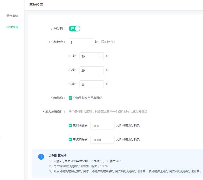 3、開啟分銷購物自己有分潤時,分銷員購物所得分潤按1級分潤百分比計算,該分銷員上級分潤按2級分潤百分比計算。